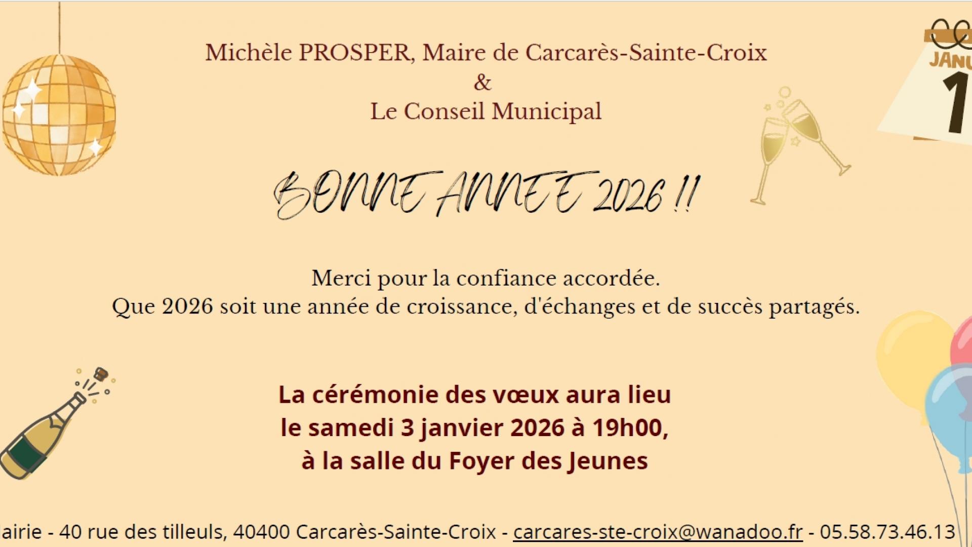 Les habitants de la Commune sont cordialement invités à la cérémonie des voeux qui se déroulera à la salle du Foyer des Jeunes